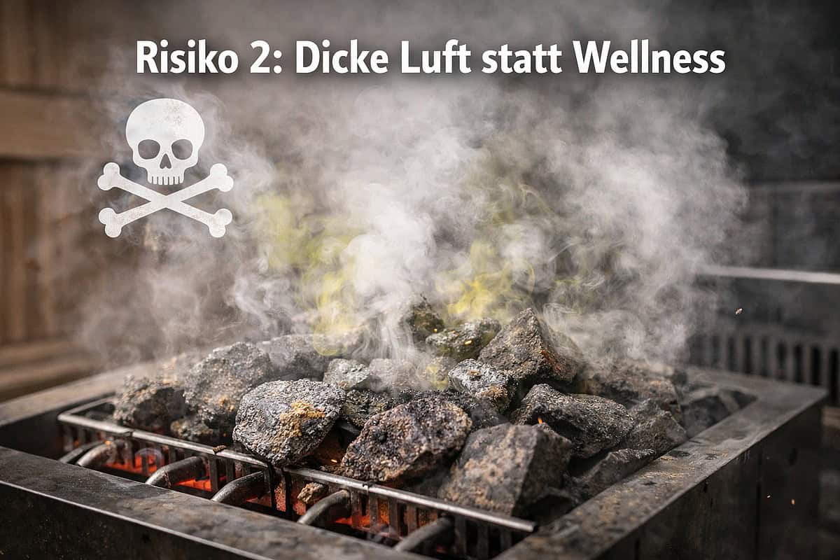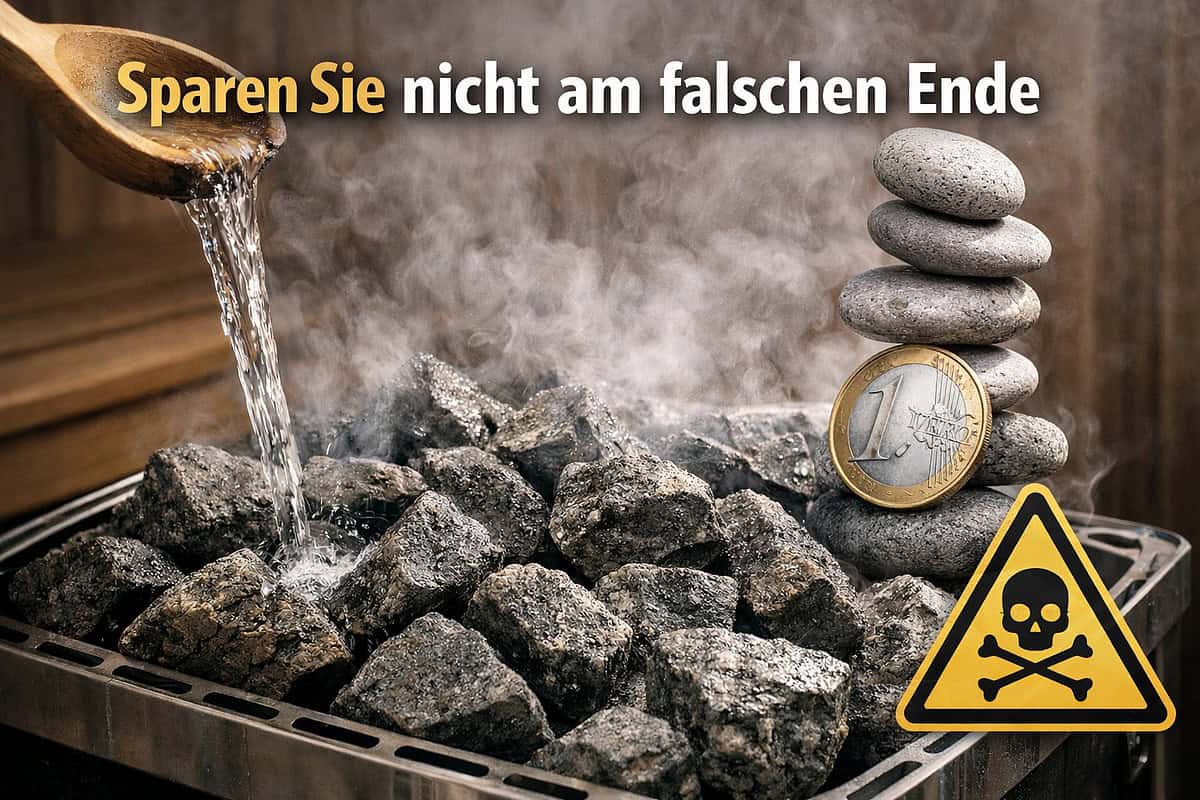 Nicht jeder Stein ist chemisch neutral. Manche Gesteine enthalten Schwefelverbindungen, Eisen oder andere Mineralien, die erst bei großer Hitze reagieren. Statt nach frischem Holz und Aufguss riecht Ihre Sauna dann plötzlich verbrannt, metallisch oder nach faulen Eiern. Im schlimmsten Fall (z. B. bei asbesthaltigem Gestein) setzen Sie sich sogar Gesundheitsrisiken aus. Zertifizierte Saunasteine sind hingegen gewaschen und auf Schadstofffreiheit geprüft.