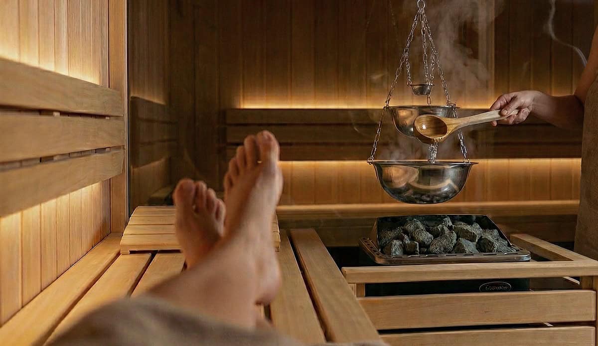 - Konstante Wolke statt „Zisch-Effekt“: Anders als beim klassischen Aufguss auf die Steine gibt es hier keinen plötzlichen Hitzeschlag. Stattdessen hast du eine konstante Abgabe von Luftfeuchtigkeit und Duft über 15–20 Minuten. Das hält die Schleimhäute dauerhaft feucht und schont den Kreislauf.